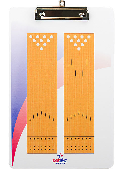 This dry erase clipboard features 4 lanes (2 on each side). Use this tool to teach lane play, show oil patterns and plan team strategy. Great for lessons and team coaching! Board measures 9" W x 15 1/2" H.